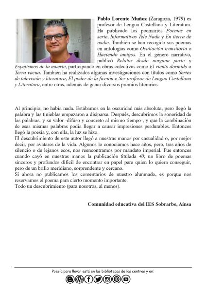 Muchas gracias al IES Sobrarbe por este número. Esperamos con ganas ese momento. Muchas gracias también por publicar a Pablo Lorente, poeta y compañero. En este enlace podéis leer otros poemas suyos publicados en Poesía para Llevar: