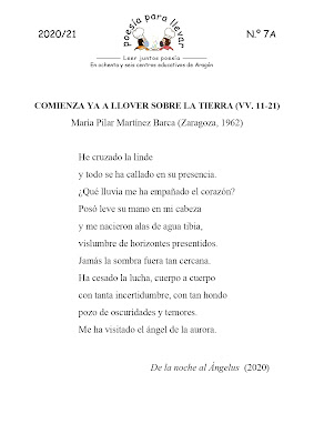 Como material complementario adjuntamos el enlace de la entrevista publicada en Heraldo de Aragón en la presentación del poemario De la noche al ángelus https://www.heraldo.es/noticias/ocio-y-cultura/2020/09/22/pilar-martinez-barca-presenta-en-el-principal-de-la-noche-al-angelus-1396379.html y otro enlace a sus artículos publicados en el periódico https://www.heraldo.es/tags/autores/maria_pilar_martinez_barca.html