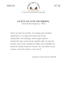 Debemos confesar que nos ha sorprendido nuestra cita anual con Poesía para llevar, que necesitábamos una autora que hablará el mismo lenguaje que nuestro alumnado y ahí estaba Elvira Sastre. Su poema nos ha permitido profundizar en los miedos en la semana más terrorífica del año. A través de su composición, hemos confesado aquellos desasosiegos que se instauran en nosotros como compañeros de vida. Así, hemos podido comprobar que poco tienen que ver con todo la iconografía que decora nuestras vidas estos días. La poesía revelada que ha realizado 1º y 2º de PMAR sobre sus temores cotidianos nos muestran objetos más cercanos como las miradas inquisitorias o la falta de vacunas. Del mismo modo, los caligramas de 2º de ESO muestran como máximo objeto de terror el enfado de una madre o un espejo que devuelve un reflejo no deseado. Al escribir estas líneas, nos damos cuenta que se ha consumado uno de nuestros mayores temores; seleccionar un poema sin título.