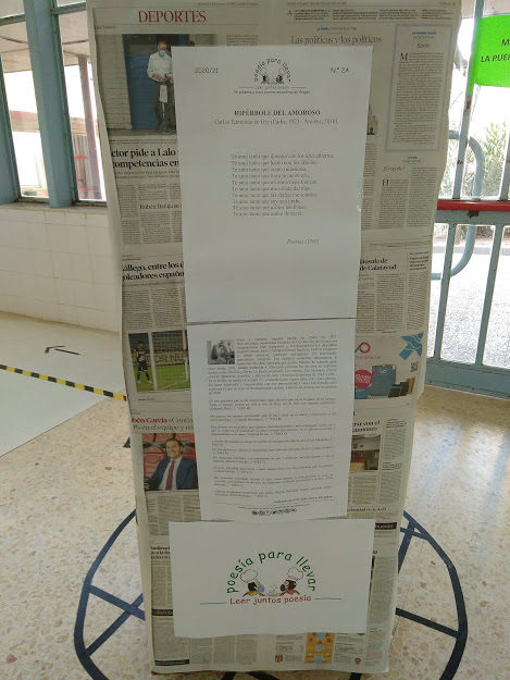 Para presentar nuestro nº1 montamos un mini mural en las tres entradas que dan acceso al ies. Aprovechamos de la cinta de señalización sobrante del plan de contingencia para ADVERTIR del comienzo de PPLL. También hemos aprovechado un expositor que utilizamos para otra actividad, hecho por el alumnado del Ciclo de Madera y Mueble del centro, que nos va a servir para exponer los poemas en Din A 3. Como tiene ruedas, lo podemos ir moviendo.Por último incluimos fotos de una actividad hecha por el alumnado de 4º Flexible sobre el poema 2 A, Hipérbole del amoroso, que los alumnos de este grupo continuaron. Les quedó tan bien que lo hemos expuesto en uno de los pasillos del centro. A ver si entre todo damos un poco de alegría al ies, que buena falta nos hace. Podéis ver las fotos AQUÍ.