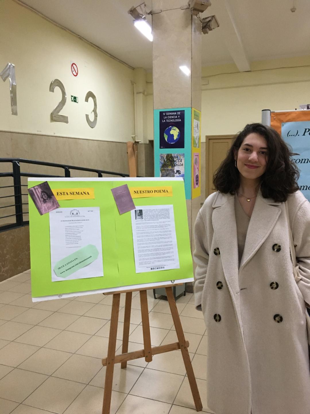 El poema de Aitana salió, como veis, pocas semanas antes del confinamiento y, por eso, Aitana ya no pudo venir a clase, como teníamos previsto, para comentar su poema con nuestros alumnos (enviasteis también ese vídeo sobre la palabra más bonita de Aragón).Aitana sí que se hizo un foto en el vestíbulo del IES, que envío ahora con algunos enlaces en los que pueden leerse las entrevistas que han ido realizándole estos días. Aitana recibió la noticia al salir de clase, a través de una llamada de Luis Alberto de Cuenca; no podía creérselo. Un premio de poesía con 20000 euros de dotación supone un reconocimiento y un empujoncito tremendo. Está feliz. Presentará el libro en Madrid el próximo mes.