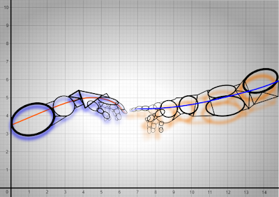 Desde el IES Valle del Jiloca nos llega una muestra de cómo han trabajado el poema 40 en clase. Es un dibujo inspirado en los conceptos matemáticos que aparecen en el poema, como límites, cónicas, polígonos, y en el Adán de Miguel Ángel, que se acerca asintóticamente al Creador.
