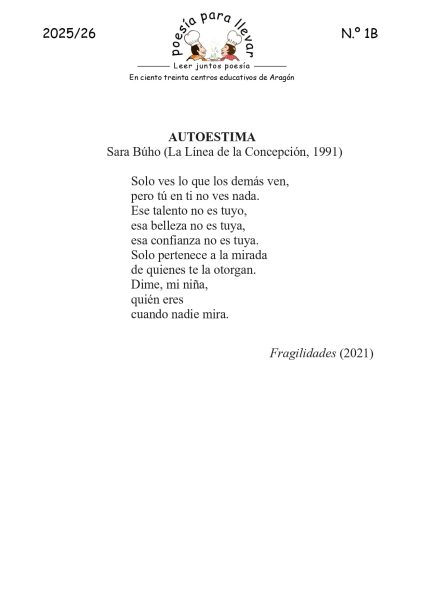 Hemos elegido este poema de Sara Búho porque nos parece que trata un tema que es fundamental para nuestro alumnado LA AUTOESTIMA No es una elección casual, sino que responde a una necesidad profunda de nuestros días. Su lenguaje es claro y cercano. No hace falta descifrarlo; se siente al instante. Esto hace que su mensaje llegue con más fuerza y verdad que otros poemas más complejos.