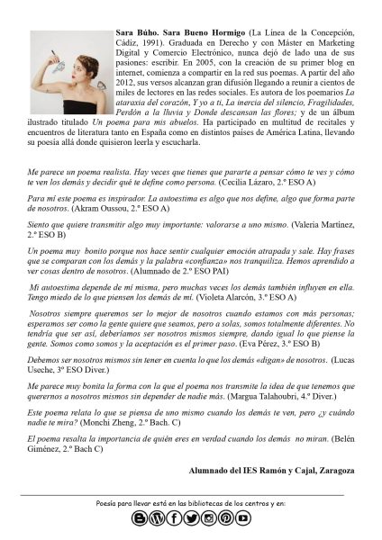 El IES Ramón y Cajal, de Zaragoza, no podía haber elegido un poema mejor para empezar la colección. Nos invita a leer «Autoestima», de Sara Búho.