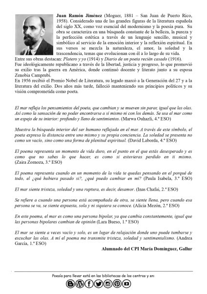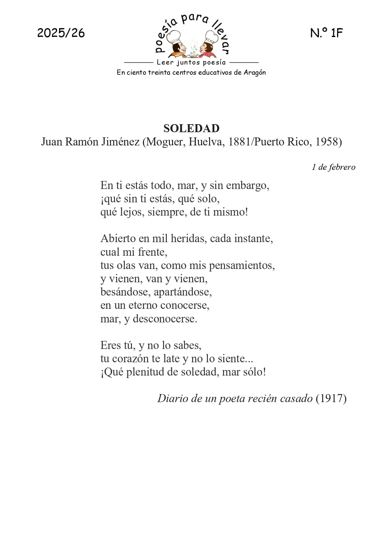 Muchísimas gracias al CPI María Domínguez, de Gallur, por este número 1 en el que podemos disfrutar de los versos de Juan Ramón Jiménez, no podíamos imaginar mejor comienzo de PPLL. Además, ese poema, como muy bien señaláis en la justificación y las actividades, puede servir para tratar temas muy cercanos a nuestros adolescentes. Muchísimas gracias también por los enlaces para conocer mejor la poesía de Juan Ramón. Por nuestra parte, recordamos los poemas de JRJ publicados en Poesía para Llevar: