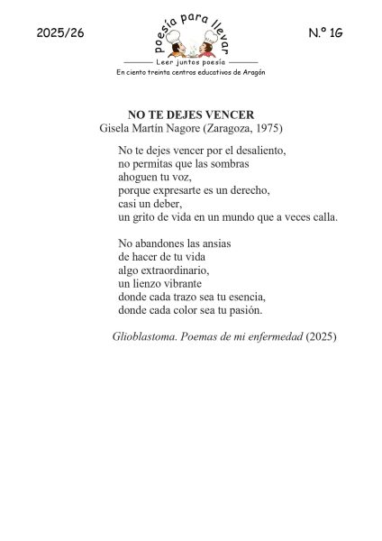 El número 1G nos llega desde el IES Reyes Católicos. Su título es No te dejes vencer» y su autora es Gisela Martín Nagore. No decimos más. Cedemos la palabra al centro para que expliquen por qué han elegido este poema y cómo lo han trabajado:
