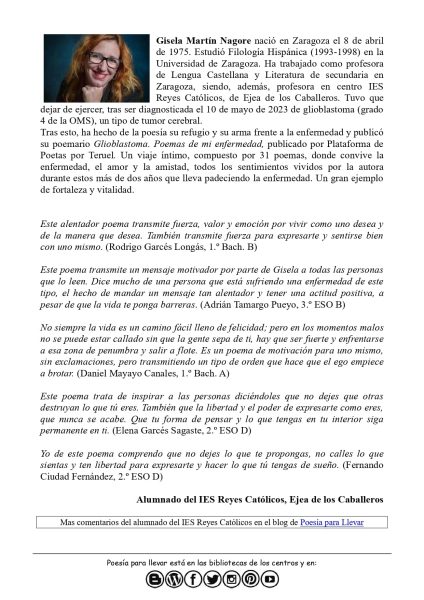 Gisela Martín es profesora de Lengua Castellana y Literatura de vocación, natural de Aragón y, además, trabajó, durante un curso, en nuestro centro. Además de seleccionar a una compañera de profesión y amiga, para algunos miembros del Departamento de Lengua Castellana y Literatura, consideramos a Gisela un ejemplo de fortaleza y superación. Fue diagnosticada en 2023 de un glioblastoma, esto es, un tipo de tumor cerebral, hecho que la motivó, ni más ni menos, a escribir su poemario Glioblastoma. Poemas de mi enfermedad, en el que se inserta el poema seleccionado. Por si no fuera poco, tanto nosotros, como nuestro alumnado, va a tener el placer de disfrutar de su compañía y sabiduría hoy, día que sale nuestro número, inaugurando el programa de Poesía para Llevar.