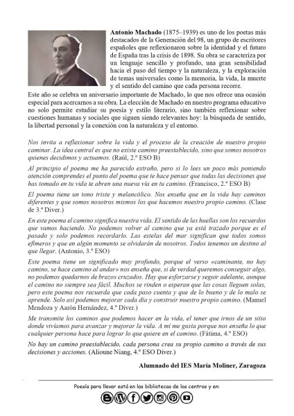Muchísimas gracias al IES María Moliner por traernos estos versos de Machado, darlos a conocer a nuestro alumnado y rendirle así el homenaje que se merece. Es uno de los grandes poetas del siglo XX.
