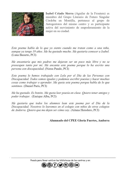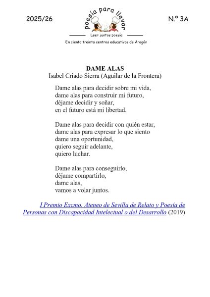 En el Colegio Público de Educación Especial «Gloria Fuertes» hemos elegido el poema «Dame Alas» porque este año, por casualidad, nos ha tocado entregar poema el 3 de diciembre, Día Internacional de las Personas con Discapacidad. Este poema, escrito por Isabel María Criado Sierra, una mujer con discapacidad intelectual, fue el primer finalista del I Premio de Relato Corto y Poesía del Ateneo de Sevilla. Isabel, pertenece al Grupo Literario de Montilla, de Futuro Singular Córdoba, y escribió este poema, según ella, porque «quiero decidir sobre mi vida, tomar mis propias decisiones».