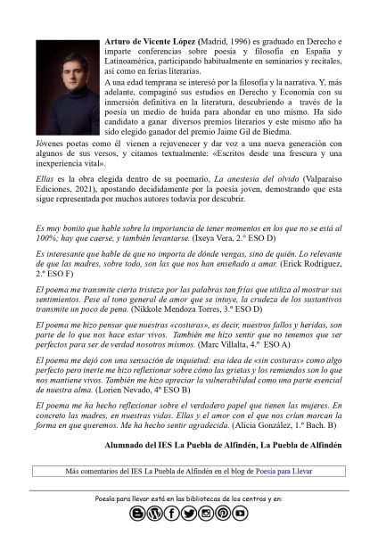 Muchísimas gracias al IES La Puebla de Alfindén por descubrirnos a este poeta ,al que no conocíamos, y por apostar por la poesía joven. Muchísimas gracias también por la completísima batería de actividades: poemas gemelos, creaciones literarias, cartas de agradecimiento, metáforas, entrevistas.. Enhorabuena por vuestro trabajo y por el de vuestro alumnado.