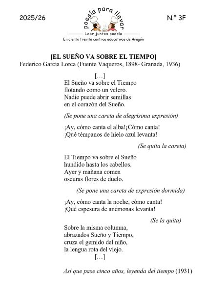 Muchísimas gracias al CPEPA LA Almunia por este número tan completo; por publicar un texto tan especial de Lorca que es poema, es teatro y se convierte en canción con todos sus cambios y versiones. Muchísimas gracias también por toda la información y por la batería de actividades tan completa. Enhorabuena por vuestro trabajo y el de vuestro alumnado y gracias por vuestra paciencia porque ha sido difícil ajustar el texto de la cara A.
