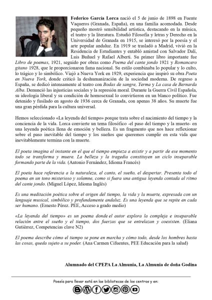 Desde el centro nos comparten también un completísimo documento con la biografía de Lorca, el poema y sus versiones, enlaces de interés, reportajes y una batería de actividades: