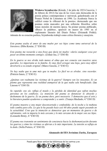 Muchísimas gracias al IES Jerónimo Zurita por este número: por publicar a Wislawa Szymborska, una de las grandes poetas del siglo XX; por la elección del poema, que provoca tantas preguntas y respuestas y tan acertado para estos momentos, y por la completísima propuesta didáctica que nos habéis compartido. Seguro que servirá de ayuda a muchos de los centros de la rueda.
