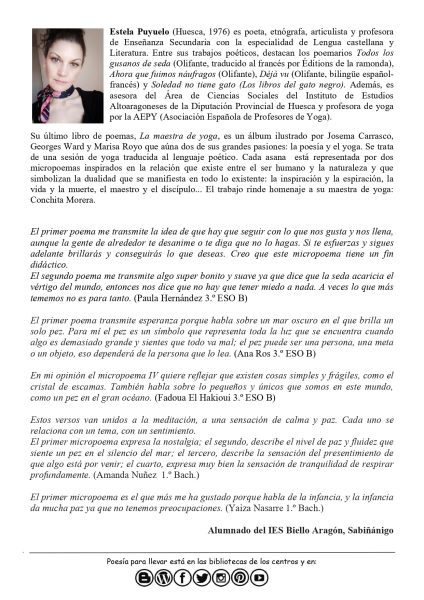 Muchísimas gracias al IES Biello Aragón por este número cargado de sorpresas. Muchísimas gracias por vuestra elección, Estela Puyuelo es una de nuestras poetas preferidas y celebramos siempre la publicación de sus versos. Muchísimas gracias también por este planteamiento tan original, creemos que es la primera vez que alguien nos propone combinar poesía y yoga y vais a crear tendencia.