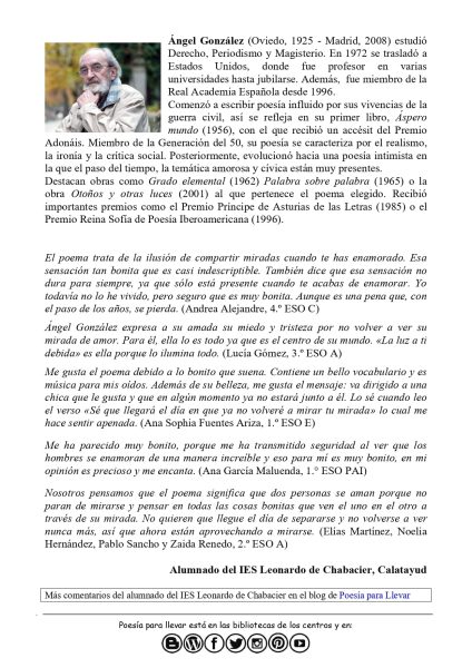 Muchísimas gracias al IES Leonardo de Chabacier por este número. No podíamos despedir mejor el año que con esta celebración que habéis preparado para homenajear a Ángel González. Muchísimas gracias por todo el material que compartís, que servirá al resto de centros de la rueda tanto para este poema como de inspiración para sus actividades. Es casi imposible destacar alguna sobre el resto por lo que preferimos enumerarlas para adelantaros todo lo que podéis encontrar: «La belleza del mundo en tus ojos»: dibujo + verso,«Libro de poemas de Ángel González», «Gafas para ver la belleza del mundo», «Reescritura invertida» el poema desde la otra voz,«Asombros cotidianos»: fotografía + texto poético, elaboración de cartas; creación de: canciones, antologías de poemas de Ángel González e infografías; presentación y comprensión del poema; análisis del lenguaje y selección de palabras clave y escritura creativa sobre el amor en la poesía. Enhorabuena por este magnífico trabajo y un aplauso para ese alumnado tan creativo.