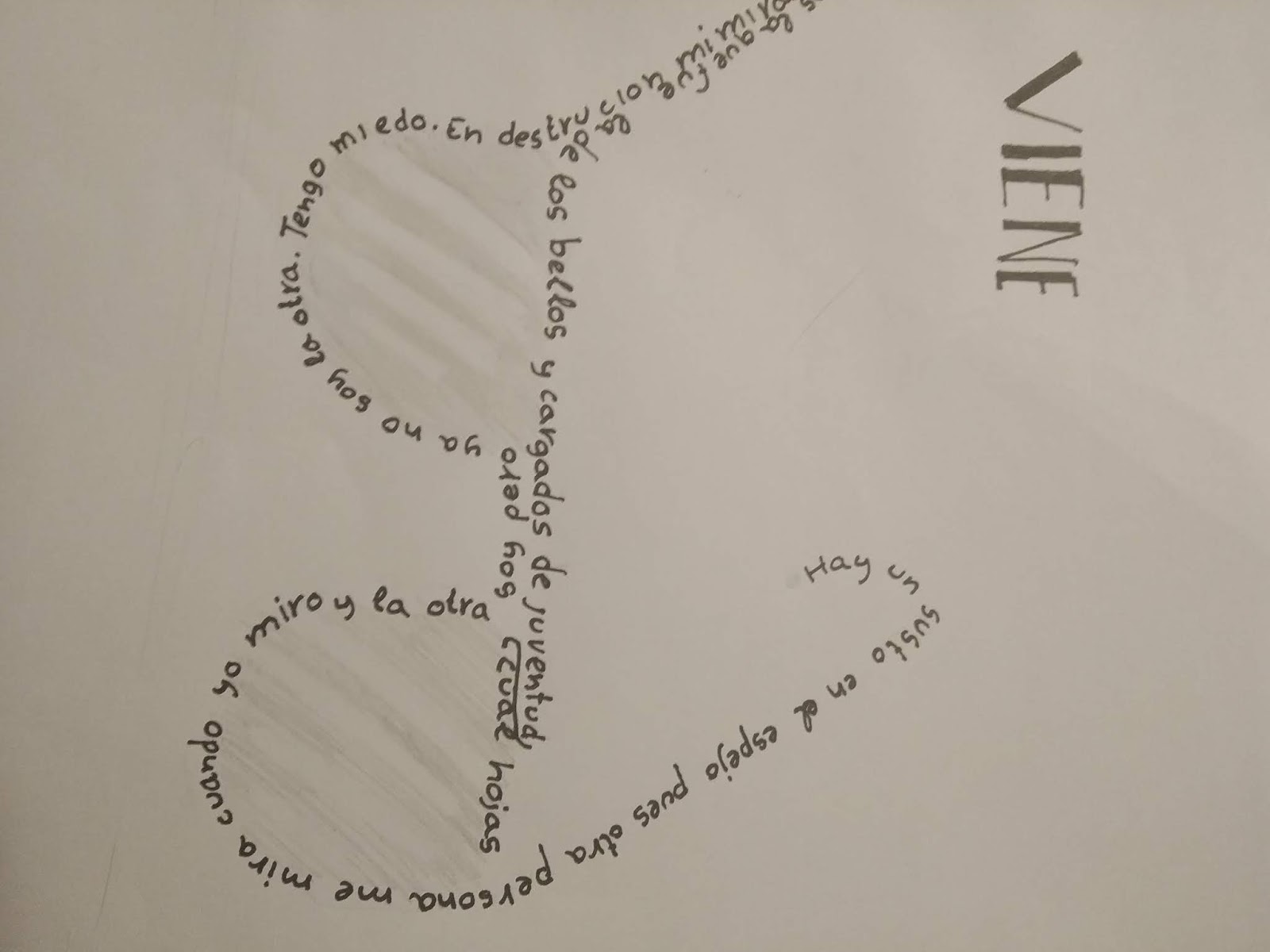 En cuanto a las actividades propuestas para el poema, os adjunto un enlace a la ficha de la que estamos trabajando de forma voluntaria y a algunas fotos de caligramas que ha realizado el alumnado de 1º de ESO.