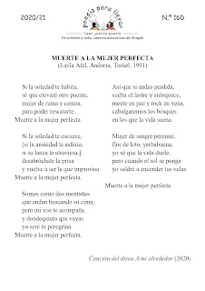 Es Belén Cucalón o Layla Añil nuestra poeta cantautora. Hemos adaptado la letra de una de sus canciones, que son pura belleza y que encierran un mundo por descubrir, aunque ella nos desvela esos secretos, que podéis hacer llegar a vuestros alumnos. El título: «Muerte a la mujer perfecta».