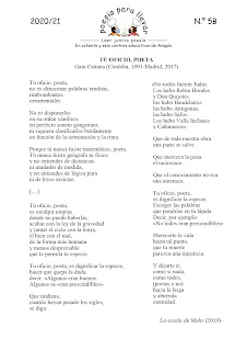 Solo Gata Cattana sería capaz de hablar del oficio del poeta con tanta contundencia como en estos versos. Ella misma muchas veces tuvo que explicar por qué escribía poesía y si era poeta o rapera. Como si su arte se pudiera encasillar en una palabra y la poesía y la música fueran compartimentos estancos.Gracias a la Escuela de Arte de Huesca podemos leer en Poesía para Llevar sus versos y plantearnos también cuál es el verdadero oficio del poeta. Cedemos la palabra al centro porque explican mucho mejor que nosotros por qué han elegido a esta artista y cómo han trabajado el poema:Este año nuestra aportación a Poesía para llevar ha sido un descubrimiento muy grato y emocionante: Gata Cattana. Una joven promesa que prematuramente vio su vida truncada y pese a ello, nos dejó un legado de versos y letras que ha servido de inspiración al rap en nuestro país.Escogimos «Tu oficio, poeta» del poemario La escala de Mohs y tenemos la suerte de poder escucharlo recitado por ella misma, en uno de los concursos de Slam Poetry en Granada, a los que era asidua.Rebelde, reivindicativa y culta, decía de ella misma que era «poetisa de día, rapera de noche y politóloga a ratos».Estos días es noticia, dado que su madre ha recopilado, para su publicación, poemas y textos inéditos. No vine a ser carne es el título de esta obra. Este es el enlace a una entrevista que han hecho a su madre:Ha inspirado, además, a artistas urbanos. Encontramos multitud de graffitis e incluso un conmovedor homenaje artístico en Granada que deja constancia de su influencia:Muro homenaje: https://www.youtube.com/watch?v=Bmi_G9YHObM&feature=emb_logoEstudiantes de la Escuela de Arte de Huesca se han dejado llevar por este poema y nos han regalado versos breves; una selección de ellos publicados en la cara B e incluidos en un hilo poético que irá creciendo en twitter, la red social elegida para la difusión de los poemas del programa. Inauguramos la semana de nuestra publicación con algunos de los trabajos de estudiantes de 2º de Gráfica Publicitaria, realizados en torno a la figura de Gata Cattana que próximamente verán la luz en una exposición.Este es el hilo que podéis seguir:Acabamos con las palabras con las que presentó al público su poema:«Dedicado especialmente a los compañeros poetas y a todos los que alguna vez les haya dado por esa estúpida manía de escribir».