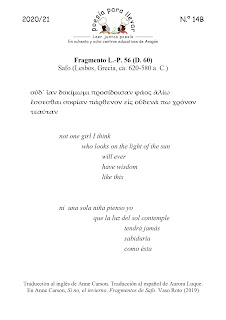 Desde el IES Jerónimo Zurita os hacemos llegar una doble propuesta, relacionada con la labor de la traducción y el trabajo editorial de los textos literarios. Hemos seleccionado un fragmento de Safo de Lesbos, primera poeta de la que tenemos noticia (y que ya ha sido publicada con anterioridad en el proyecto de Poesía para Llevar), del que ofrecemos una traducción de la poeta en lengua inglesa Anne Carson. Nos hemos centrado en esta ocasión en esta última, para dar valor a su trabajo de explicación de la poesía clásica, investigación universitaria acerca del mundo grecolatino y la función que todo ello presenta su obra posterior como creadora.El punto de vista al que prestamos más atención es, en este caso, a la traducción, siempre que se otorgue a ésta un valor literario y se contextualice en un trabajo que le dé significado, la ordene y actualice en un punto de vista coherente con el resto de su obra personal (para introducir mejor la obra de la autora, podemos utilizar los vídeos que se adjuntan). Nos interesaba abrir la explicación al inglés, en una primera versión, para trabajar de manera interdisciplinar y reflexionar con nuestros alumnos sobre el acto de la traducción y su posible inspiración para crear textos a continuación (como hemos propuesto en las actividades).La escucha de distintos poemas de Anne Carson nos han llevado a entender una práctica profesional y de calidad que también forma parte del trabajo de la publicación y la edición de la literatura, que hunde sus raíces en el pasado y en la tradición. Además, hemos descubierto la modernidad de los planteamientos de Safo en nuestro contexto del siglo XXI y la importancia de seguir publicando sus escritos, o investigándolos (ello ha llevado al trabajo específico en Bachillerato en las asignaturas de Griego y Oratoria con otras actividades), así como hemos iniciado el debate sobre la autonomía de la traducción (incluimos aquí la versión del poema en gallego).ENLACES SOBRE ANNE CARSONPara conocer mejor la trayectoria y trabajo de Anne Carson, proponemos este vídeo, enmarcado en las celebraciones de los Premios Princesa de Asturias 2020. Incluye una presentación del editor de dos de sus libros, Jordi Doce y va seguida de un recital poético de voz de la autora.En este segundo enlace, varios poetas y escritores escogen y recitan poemas de Anne Carson (como Marta Sanz, Mario Obrero- último ganador del Loewe – o Elene Medel)
