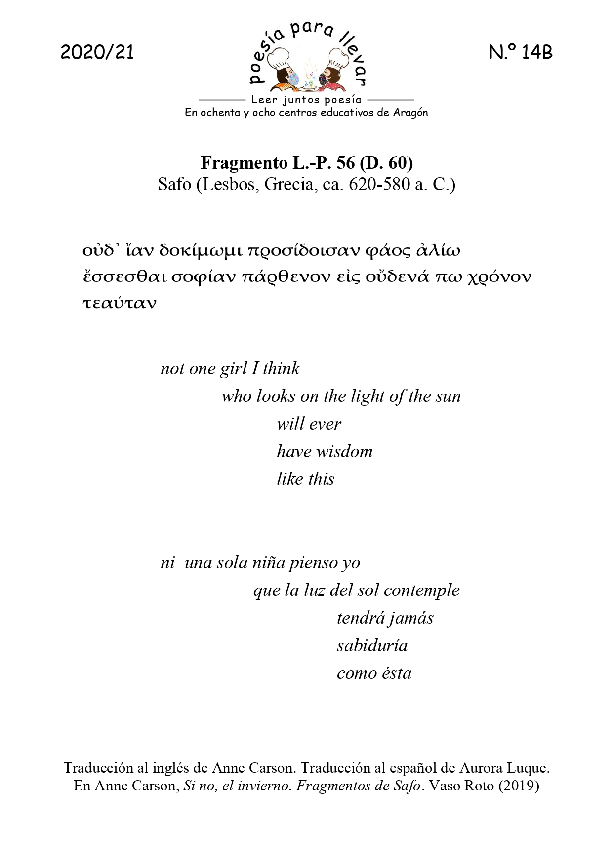El poema 14B es una exquisitez, una perfecta caja china (o quizá sería mejor decir griega) que aúna las voces de tres grandes poetas: Safo, Anne Carson y Aurora Luque en un delicado juego entre traducción y creación . Cedemos la palabra al IES Jerónimo Zurita que explica muy bien por qué han elegido este poema y cómo lo han trabajado: