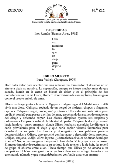 Desde el IES Sierra de San Quílez, de Binéfar nos proponen para el número 21 dos textos muy distintos en su forma y a la vez muy parejos en su fondo. A través de los versos de Inés Ramón y de la prosa de Irene Vallejo sentimos y alcanzamos lo que supone una separación. El poema lleva el título de «Despedidas» y el relato el de «Idilios Muertos».