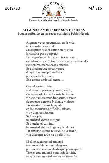 Este poema es un buen ejemplo de lo que son las noticias falsas en Internet. Recorre la red como si fuera de Pablo Neruda, incluso se dice que es de su libro de 1954 Las uvas y el viento. Y si se mira un poco más también aparece atribuido a Mario Benedetti o a Jorge Guillén. Aunque lo más probable es que sea la traducción del inglés de un poema o canción de Laurieann Kelly, que no sabemos quién es pero que nos la encontramos hasta en Amazon. Lo que sí está claro es que no es de Neruda: no aparece en ninguno de sus libros y no resiste la comparación con ninguno de sus poemas. Queremos que sirva como demostración del cuidado que se ha de tener al utilizar Internet como fuente de información; pero también hemos querido publicarlo porque está claro que mucha gente se lo ha «llevado» consigo para buscar consuelo. Por último, os animamos a que nos ayudéis a desentrañar esta madeja poética y que propongáis a vuestros alumnos y alumnas que investiguen y rastreen su posible autoría y que busquen más ejemplos de poemas atribuidos a…