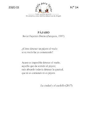 Leemos sin barreras, podemos sumergirnos entre letras y desestabilizarnos con las palabras que otra persona eligió. Javier Fajarnés es un poeta zaragozano muy joven, en este poema juega con el orden y el sentimiento de ser pájaro y no serlo, de descubrirnos como parte del filo y también de la navaja. Desde el IES Siglo XXI os invitamos a conocer, leer y descubrir a este poeta aragonés que debemos empezar a reivindicar.Acercar la poesía como género a los alumnos puede resultar una tarea complicada, sin embargo es probable que si asocian al autor con una imagen de alguien cercano entiendan que el género no es parte de una saga de eruditos de pelo cano fumando en pipa. Que la poesía es cúmulo y como el propio autor dice: «una forma de dar sentido a tu entorno. Es penetrar en la materia de las cosas y contemplar el mundo desde su interior. No limitarse al reflejo, sino penetrar en la materia del espejo. Construcción y deconstrucción, no mera contemplación».Además, descubrir que aquí al lado tenemos un joven con esta proyección, que participa en muchos otros proyectos tanto audiovisuales, musicales o periodísticos supone un refuerzo para el autoestima de nuestros alumnos y su capacidad de que «crear es creer».La elección de este poema tan breve llamado «Pájaro» de Javier Fajarnés, responde ciertamente a esa intención de que la poesía acerque las palabras dándoles mayor sentido. El lenguaje como elemento de juego y de respuesta para aquellos sentimientos que a veces se nos quedan dentro y no sabemos a qué responden. El pájaro es la libertad, el vuelo es la decisión y, todo los demás son millones de preguntas resumidas en dos versos. El autor tenía diecinueve años cuando escribió este poema, ¿acaso podría plasmar mejor ese sentimiento que lleva adosado la adolescencia?Desde las aulas hemos trabajado el poema ofreciendo al alumnado la posibilidad de expresar aquello que les transmitía bien en formato escrito o acompañado de imágenes. Os compartimos algunas de las propuestas que incluyen una recitación del texto.
