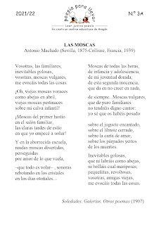 Antonio Machado era capaz de relacionar lo cotidiano con lo transcendental y convertir en asunto poético a un animal tan insignificante y molesto como las moscas. Seguro que a nuestro alumnado les sorprenderá todo lo que pueden llegar a evocar las moscas en este poema elegido por el CPEPA Miguel Hernández de Huesca. Desde el centro nos cuentan cómo lo han trabajado y nos muestran las actividades que han hecho: