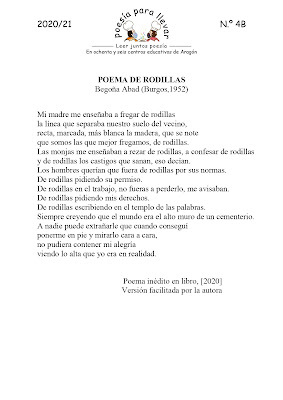 En el CPEPA Juan José Lorente han elegido un reivindicativo poema de Begoña Abad para el número 4B. Para acompañar como se merece a la autora y al poema han preparado un documento muy completo, con materiales, fotos, actividades y enlaces que compartimos con vosotros.