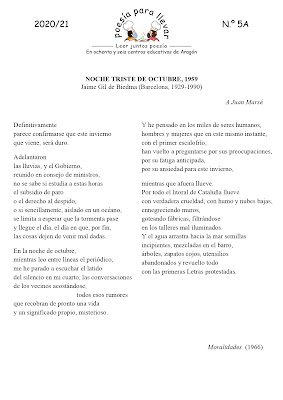 Desde el IES Juan de Lanuza de Borja compartimos con todos la «Noche triste de octubre, 1959» de Jaime Gil de Biedma. Pertenece a Moralidades (1966), y forma parte de la edición reunida de su poesía, Las personas del verbo, publicada en 1975 y 1982. Nuestro texto es el publicado por Lumen en 1998.Aunque es un poco extenso, elegimos este poema porque sus versos trascienden el tiempo y están de viva actualidad. Al leerlos, es inevitable traerlos a nuestros días y a este invierno que también se anuncia duro. Lo hemos trabajado en distintos cursos y desde distintas materias. Al pedir a los alumnos sus comentarios, la mayor parte de ellos han relacionado el texto con la pandemia y, también la mayoría han plasmado sus impresiones en imágenes más que en palabras. Por ello, os enviamos, además de los comentarios habituales al texto, las producciones artísticas de nuestros alumnos. Queremos destacar entre ellos la versión actualizada del poema a la era COVID compuesta por una alumna de 1º de ESO y la serie de acuarelas de los alumnos de Ed. Plástica y Visual de 4º. La semana próxima, coincidiendo con la publicación de nuestro poema, esperamos inaugurar una exposición en el vestíbulo del centro con todo el material que se ha elaborado, además de nuestro nuevo rincón de Poesía para llevar.Por último, queremos acompañar estos trabajos con dos documentos que nos parecen de interés acerca del autor y el poema. Se trata de un documental sobre Gil de Biedma emitido en RTVE, en 2016 en el programa Imprescindibles. Este es el enlace:Compartimos también un artículo de Juan Marsé publicado en El País en 2017. Gil de Biedma le dedicó su «Noche triste de octubre» y, casi sesenta años después, fue el propio Marsé quien le contestó en forma de carta, con motivo de la crisis catalana, a través del periódico:Marsé, otro gran autor, haciéndose eco de la atemporalidad de los versos de Biedma.Ánimo a todos con este nuevo duro invierno. Que la poesía nos ayude en el tránsito hacia la primavera.