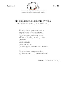 El poema 5B nos llega desde el IES Lobetano de Albarracín. Para su número semanal han elegido «Si me quieres, quiéreme entera» uno de los más famosos poemas de Dulce María Loynaz.