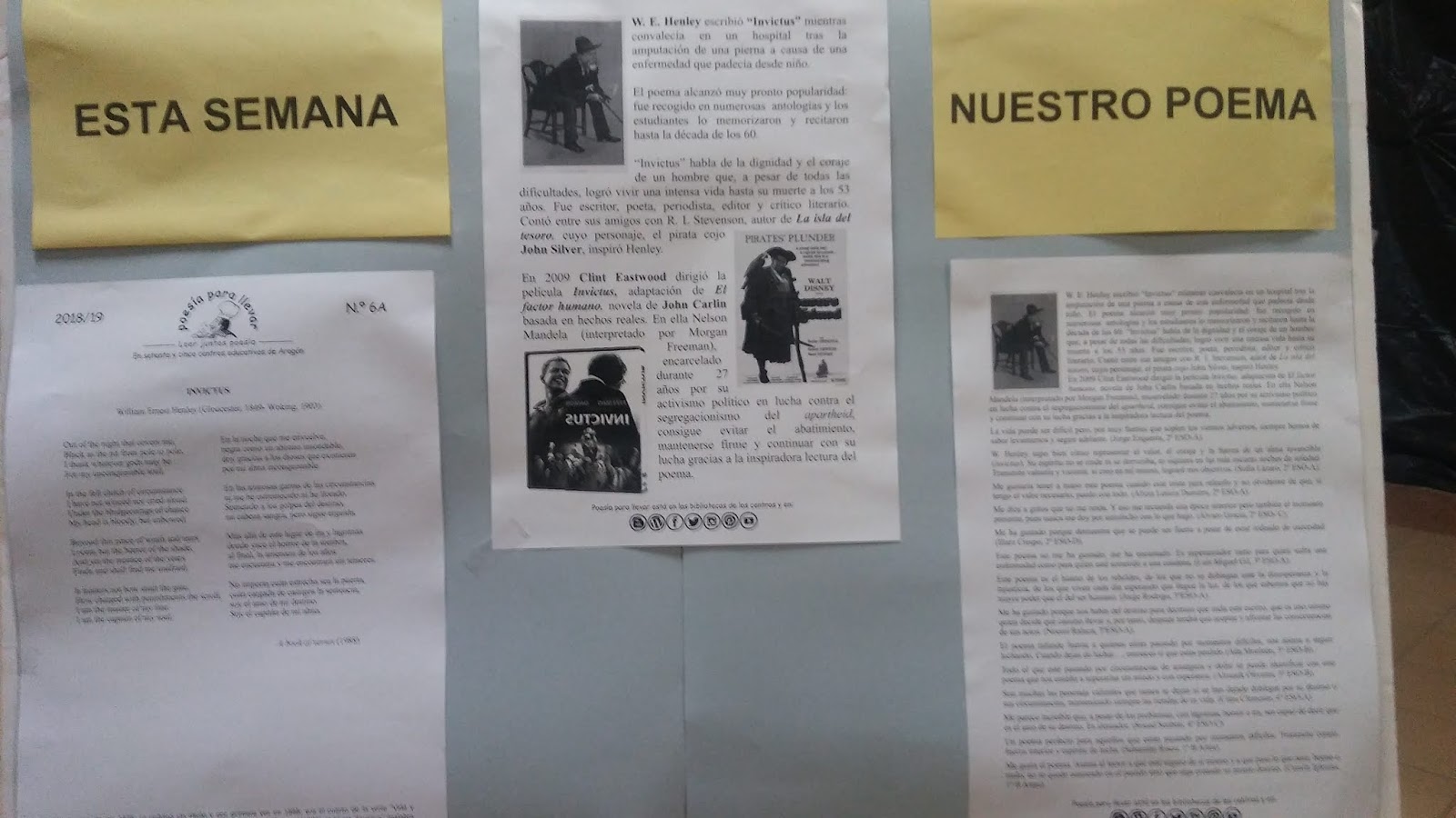 El IES Goya nos regala un poema impresionante con unos versos sobrecogedores. El poema Invictus de William Ernest Henley es su poema más conocido sobre todo después de haber servido de inspiración para Nelson Mandela durante su estancia en la cárcel. El título del poema es el que a su vez sirvió de título de una película de Clint Eastwood, en la que se narra la victoria de la selección sudafricana de rugby durante el mundial de 1995.