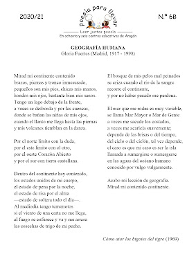 El poema seleccionado es «Geografía humana», de Gloria Fuertes.La elección de este poema parte de un programa poético que llevamos a cabo en el centro y que nos sirvió como consulta interna para proponerlo a Poesía para llevar. Los alumnos se sorprendieron y valoraron la originalidad y sencillez con la que Gloria Fuertes se describe a sí misma.