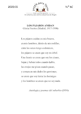 El pasado 27 de noviembre se cumplieron 22 años de la muerte de Gloria Fuertes. El azar ha querido que sea la autora elegida en el grupo B y C y así le rindamos un involuntario, pero merecidísimo homenaje. Os proponemos que os aprovechéis de esta coincidencia para poder disfrutar de una doble ración poética y os animamos a que leáis también el poema propuesto en el grupo B.El poema 6C se titula «Los pájaros anidan» y nos llega desde el IES Miguel Servet. Desde el centro nos explican los motivos de su elección, nos ofrecen una propuesta de actividades y nos envían una muestra de sus trabajos:El poema se publicó en 1954. Fresco, tierno y certero. Está pensado para el primer ciclo, aunque a todos nos convoca.Humilde proposición didáctica:El poema está seleccionado para llevarlo a las aulas de primer ciclo. Lo leeremos, lo memorizaremos y recitaremos. También nos divertiremos imitándolo y haciendo pastiches. Además, lo ilustrarán con dibujos.