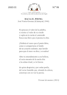 El instituto IES Comunidad de Daroca ha decidido escoger el poema del bilbilitano José Verón, titulado «Hacia el poema», incluido en su libro Un mar de montes. El poema no solamente invita a mirar «hacia» la poesía, sino a lanzarse y experimentar con la palabra. Por este motivo, este poema nos parece una maravillosa invitación a explorar el proceso de la escritura creativa, así como también, a experimentar todos aquellos sentimientos que se despiertan por el camino. Enlaces con información/entrevistas del autor: