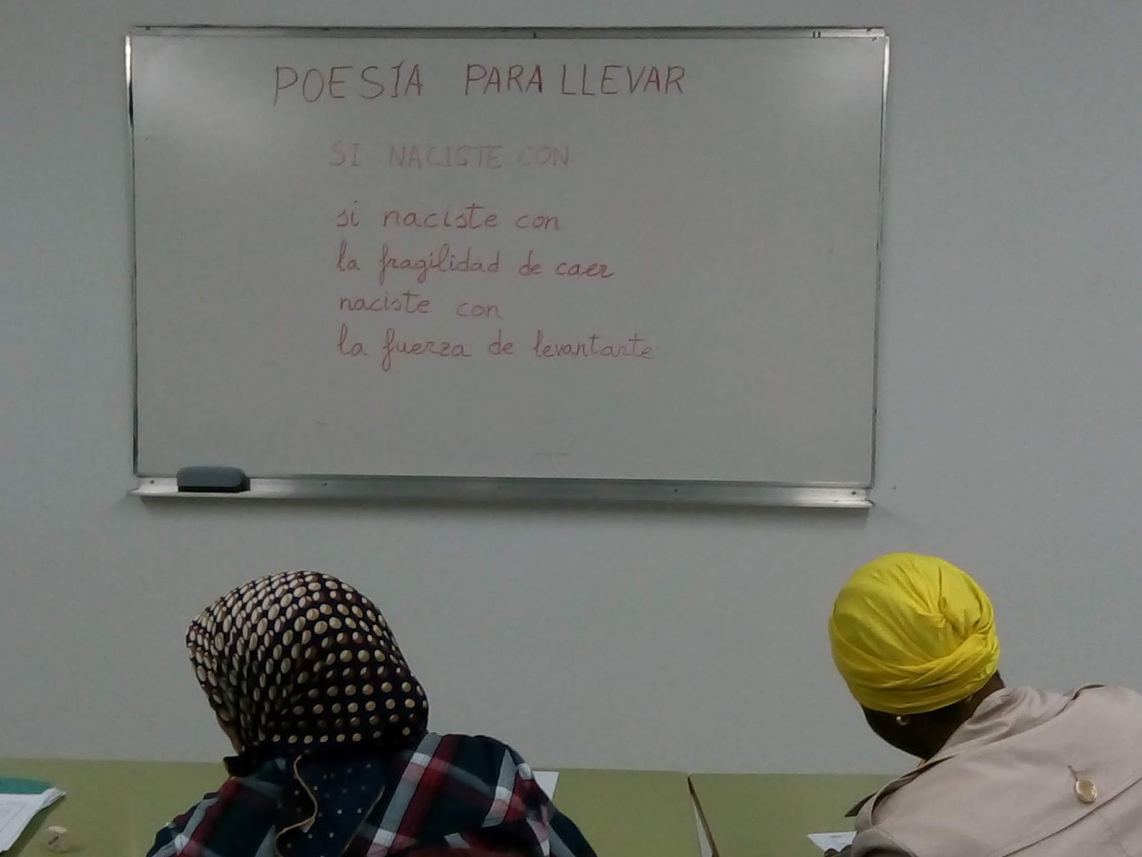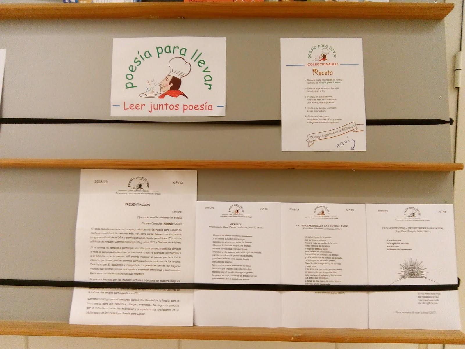 Mientras tanto, envían fotos de su expositor actual y de sus alumnos recogiendo los poemas y haciendo actividades en el aula.
