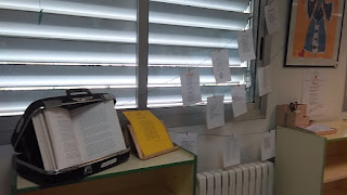 En el CPI Parque Goya están todavía formando nuestra biblioteca, son un centro integrado y este es el primer curso en el que se imparte ESO, por lo que está casi todo por hacer. Han reservado un r un espacio agradable para nuestro programa, un lugar en el que los alumnos no solo recogen el poema semanal, sino en el que también pueden colgar sus creaciones.