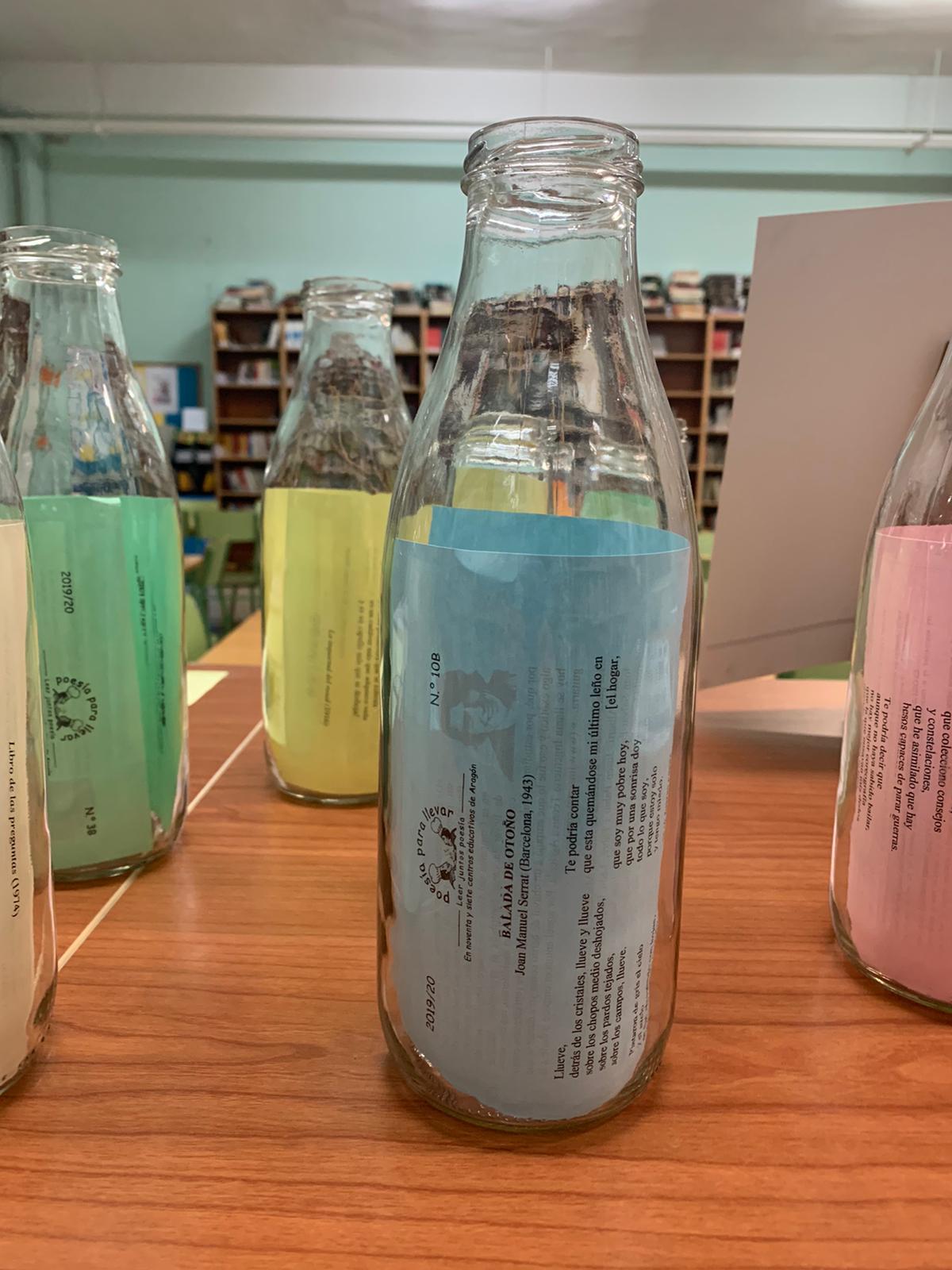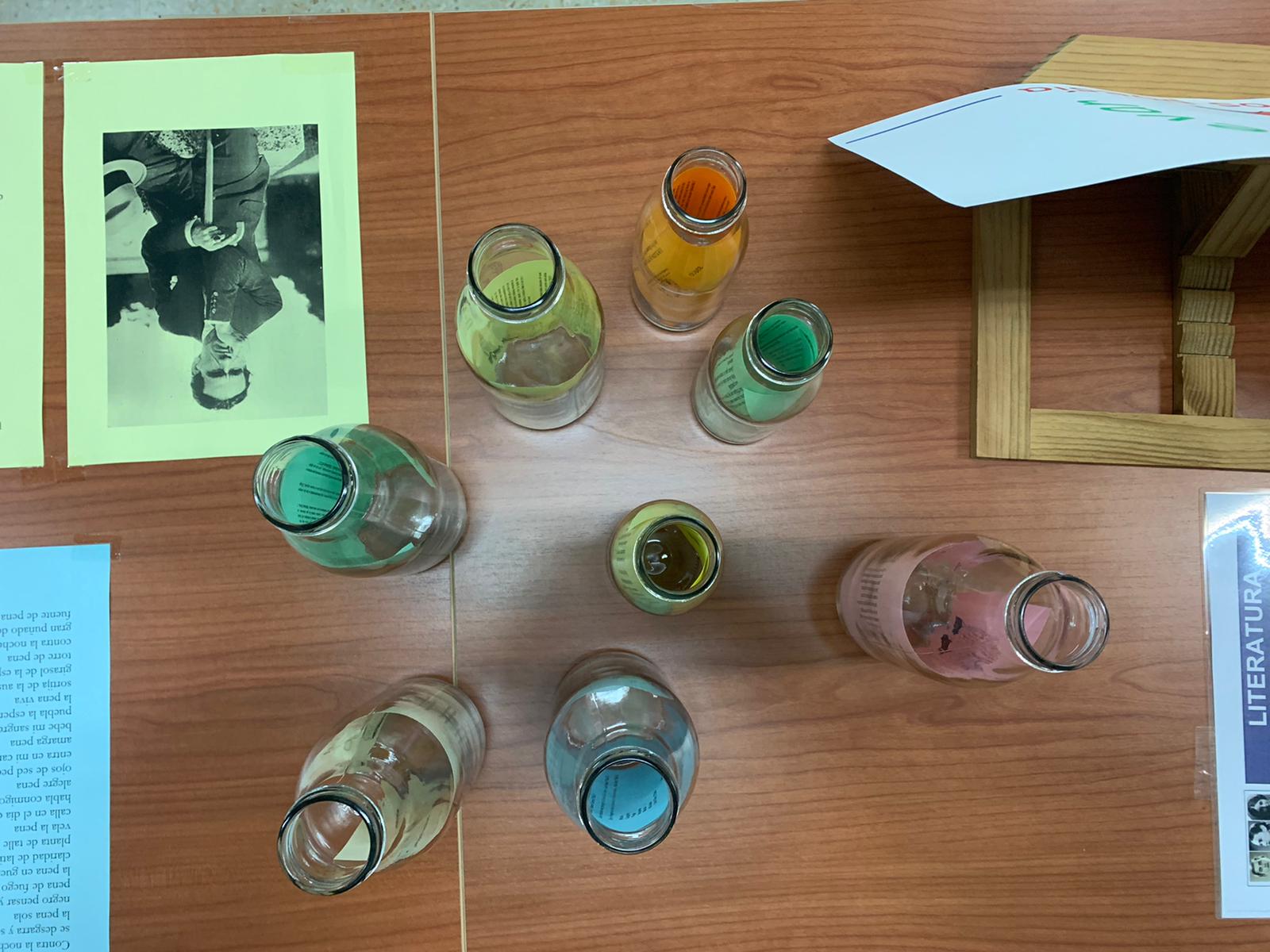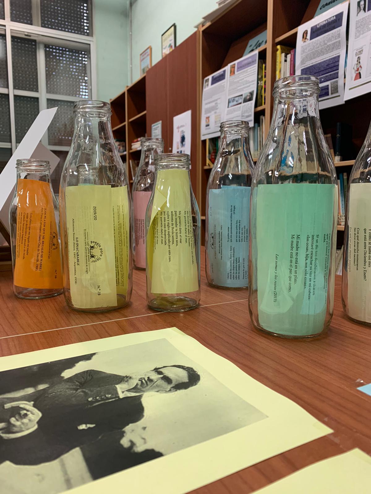 …aprovecho para enviaros unas fotos de la rincón de la poesía que hemos creado este año en la biblioteca. Jugando con el nombre de «poesía para llevar» hemos convertido los poemas en lo que sacia nuestra sed de poesía y los hemos metido en botellas. Junto a las botellas hemos colocado poemas que incluyen la palabra «sed» y la foto de sus autores. Entre los autores que han hablado de la sed en sus poemas hemos encontrado a Federico García Lorca, Octavio Paz, Rosalía de Castro, Antonio Machado, Alejandra Pizarnik o César Vallejo. Os adjunto fotos de la instalación, aunque en ellas apenas se ven los poemas relacionados con la sed y las fotos de los autores. Cuando regresemos al centro os podré enviar más fotos.