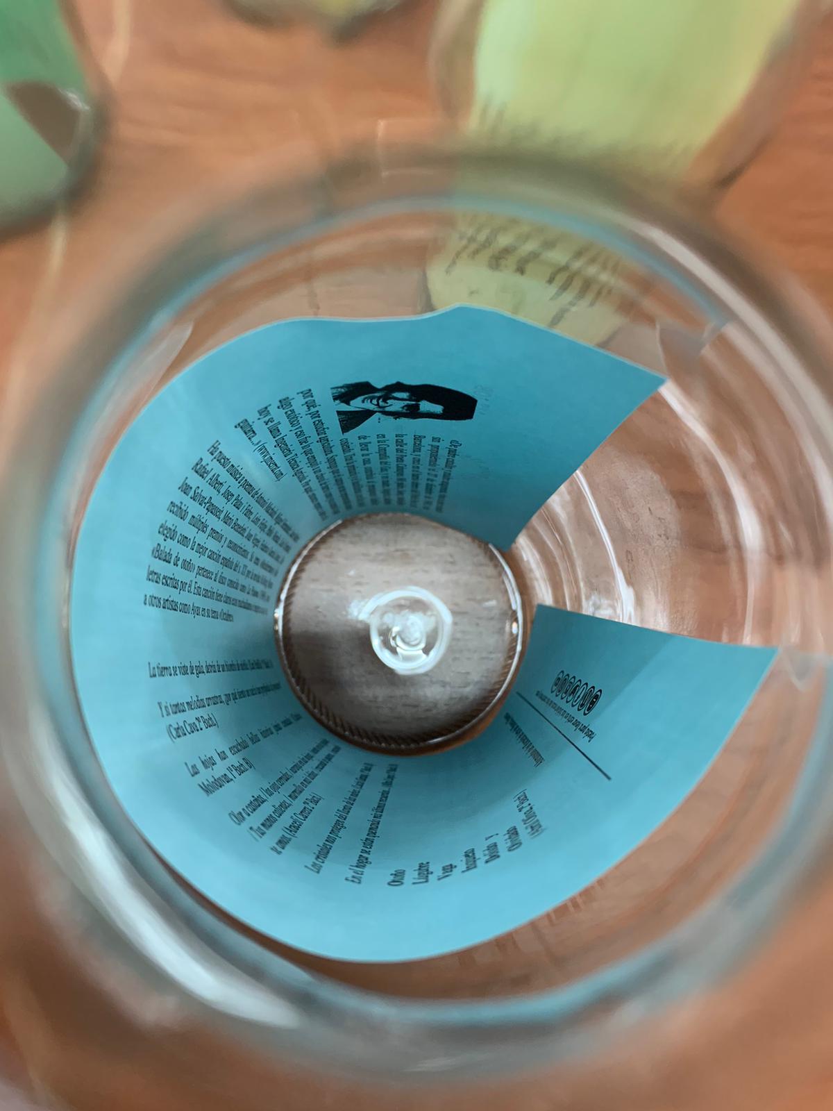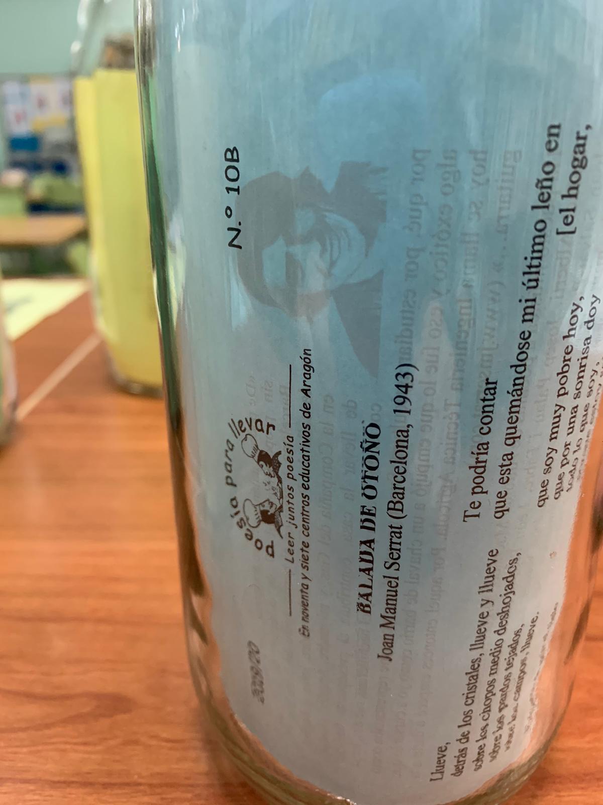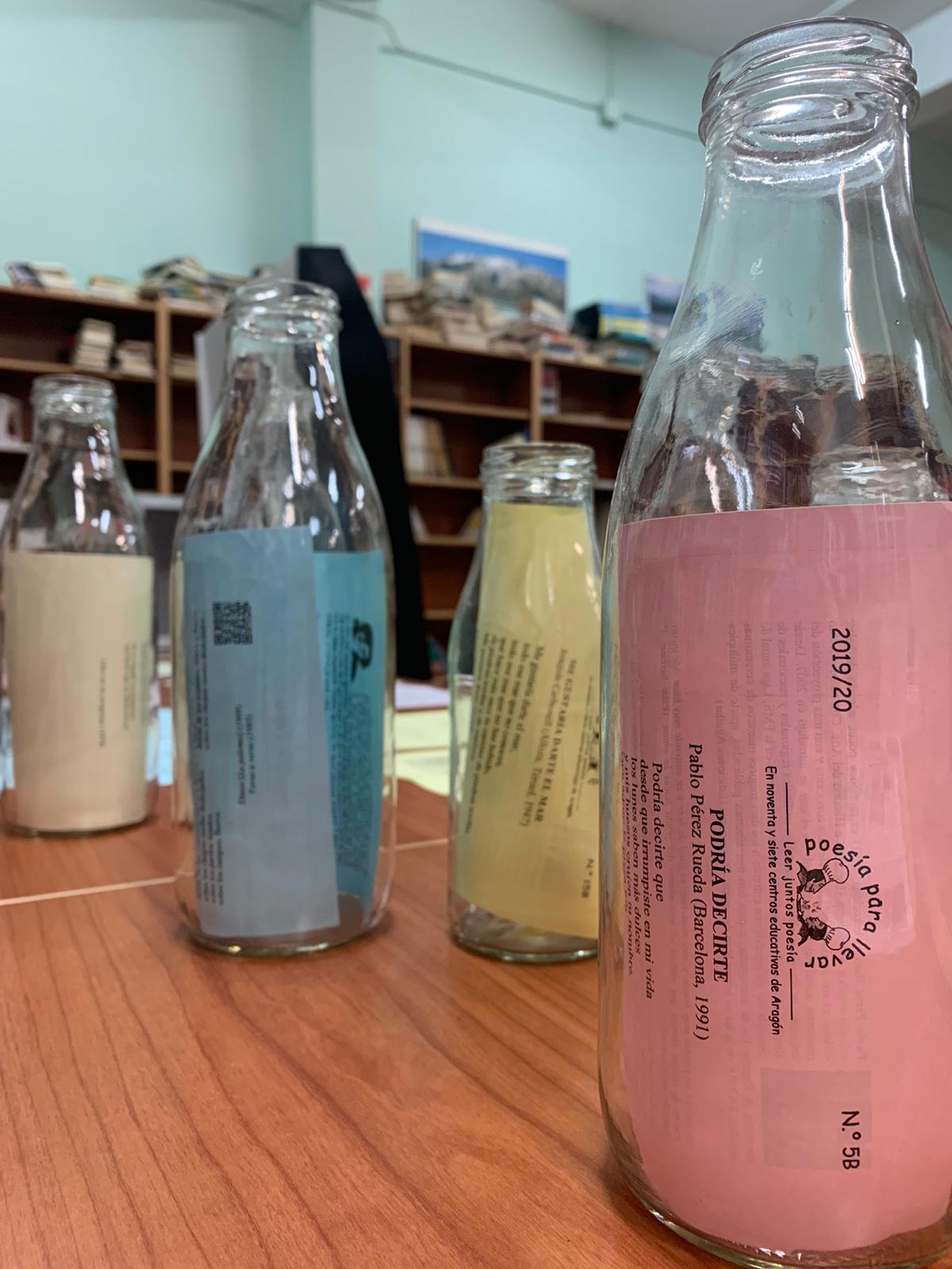 …aprovecho para enviaros unas fotos de la rincón de la poesía que hemos creado este año en la biblioteca. Jugando con el nombre de «poesía para llevar» hemos convertido los poemas en lo que sacia nuestra sed de poesía y los hemos metido en botellas. Junto a las botellas hemos colocado poemas que incluyen la palabra «sed» y la foto de sus autores. Entre los autores que han hablado de la sed en sus poemas hemos encontrado a Federico García Lorca, Octavio Paz, Rosalía de Castro, Antonio Machado, Alejandra Pizarnik o César Vallejo. Os adjunto fotos de la instalación, aunque en ellas apenas se ven los poemas relacionados con la sed y las fotos de los autores. Cuando regresemos al centro os podré enviar más fotos.