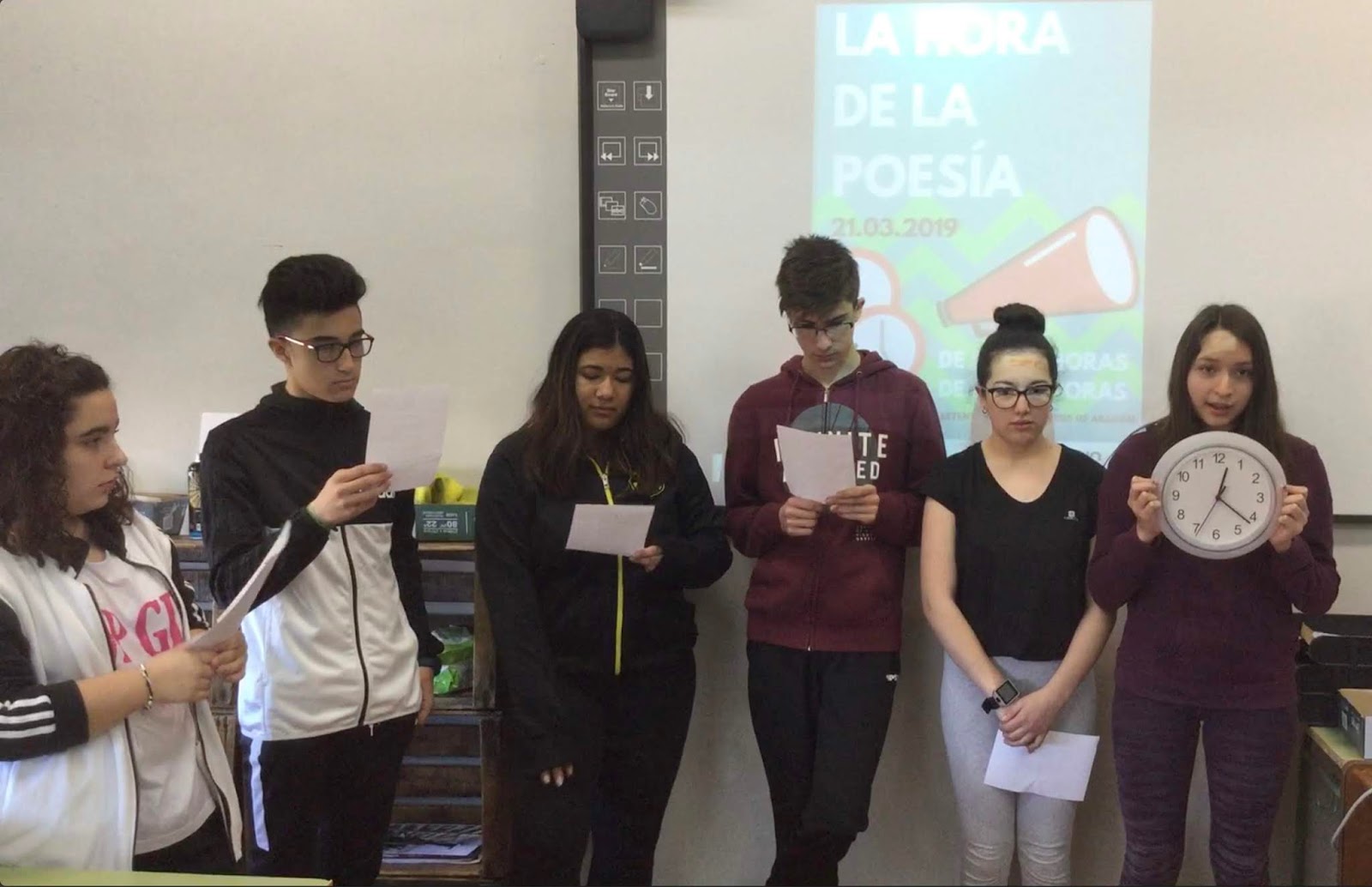«Enviamos solo un pequeño testimonio de lo que fue una jornada emocionante. Lo cierto es que fuimos las primeras sorprendidas de la respuesta del claustro a la invitación de dedicar unos minutos a la poesía. Fueron muchas las aulas que, entre las doce y la una del 21 de marzo, hicieron un paréntesis poético: el volumen de las grabaciones enviadas fue espectacular y el alumnado disfrutó de lo lindo. Van, como certificado de realidad, unas imágenes capturadas de algunas de las grabaciones.»